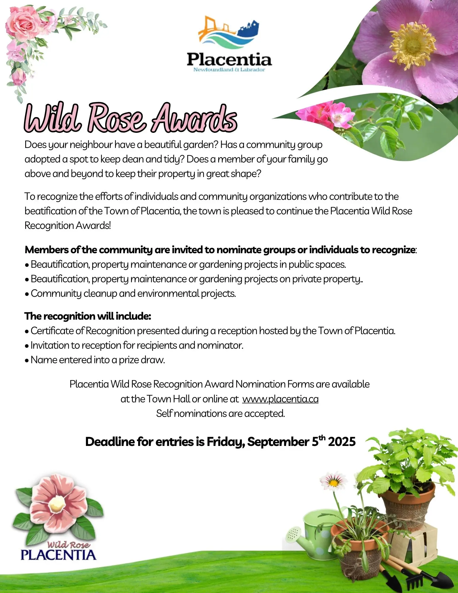 Does your neighbour have a beautiful garden? Has a community group adopted a spot to keep clean and tidy? Does a member of your family go above and beyond to keep their property in great shape? To recognize the efforts of individuals and community organizations who contribute to the beatification of the Town of Placentia, the town is pleased to continue the Placentia Wild Rose Recognition Awards for 2025! Completed nomination forms can be emailed to jbennett@placentia.ca or dropped of at the Town Hall, 25 Patterson Drive.